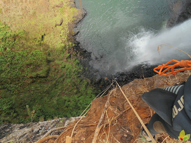 Joel makes it down in one piece (or so I assume from the absence of screams). Then the group starts going down one by one. Confidence builds up, and when it is my turn, I am actually looking forward to the descent. I peer down the edge - and it is steep. My carabiner is hooked up, and I walk backwards over the edge. After a bit, I get the hang of things, and I am enjoying the scenery. I descent slowly, taking in the view. At the bottom, the crew unhitches me. The group at the bottom is behind the waterfall. We cheer each new person who descends. Finally, Anna and Douglas does a tandem descent, and the whole group has made it down. Quite a thrill.